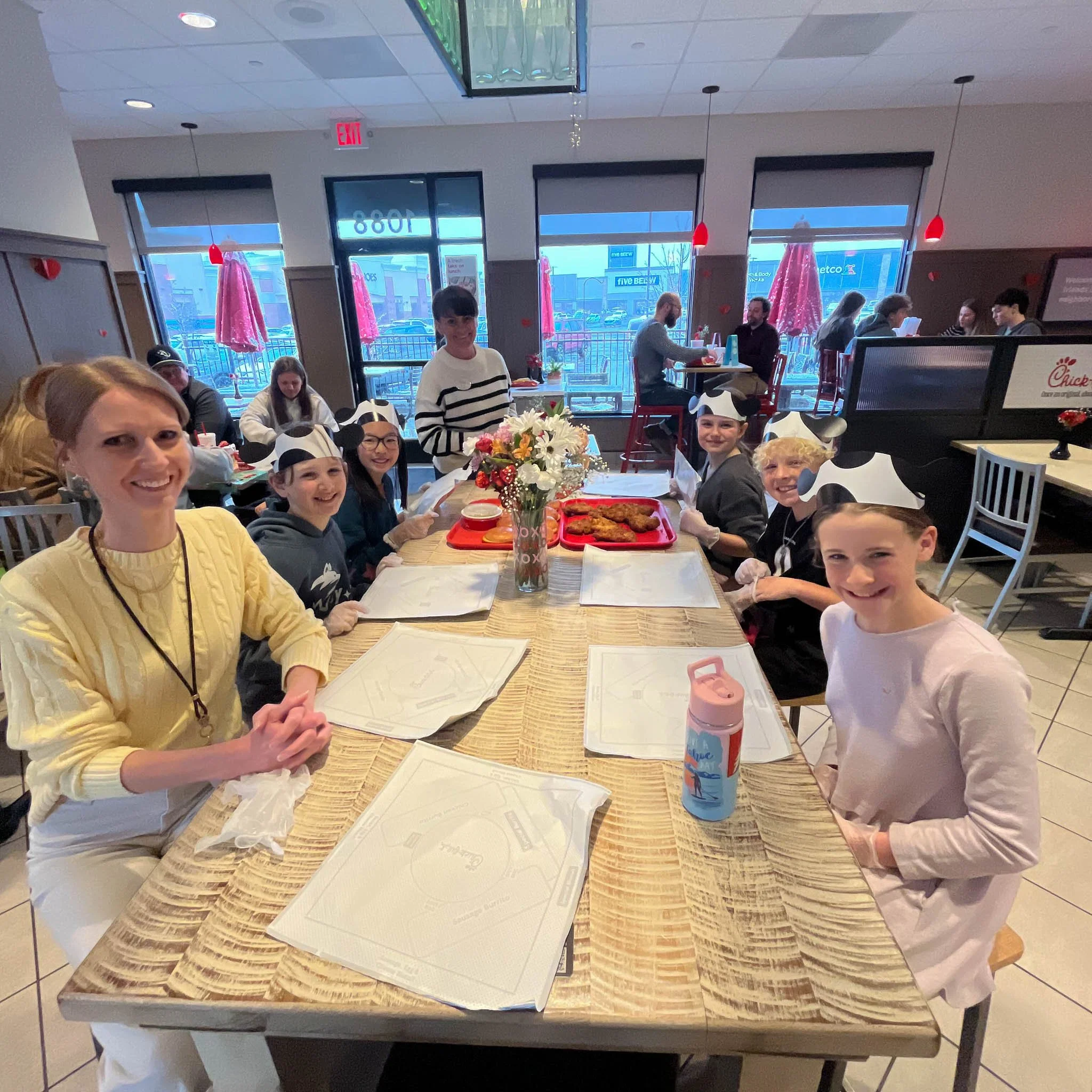 As we walked through the doors, we could smell the warm, crispy fries. We were greeted by the workers, and they gave us some cow hats to wear during our visit. Then we walked over to the story that was on the wall and learned about who formed Chick-fil-A and the story behind it.