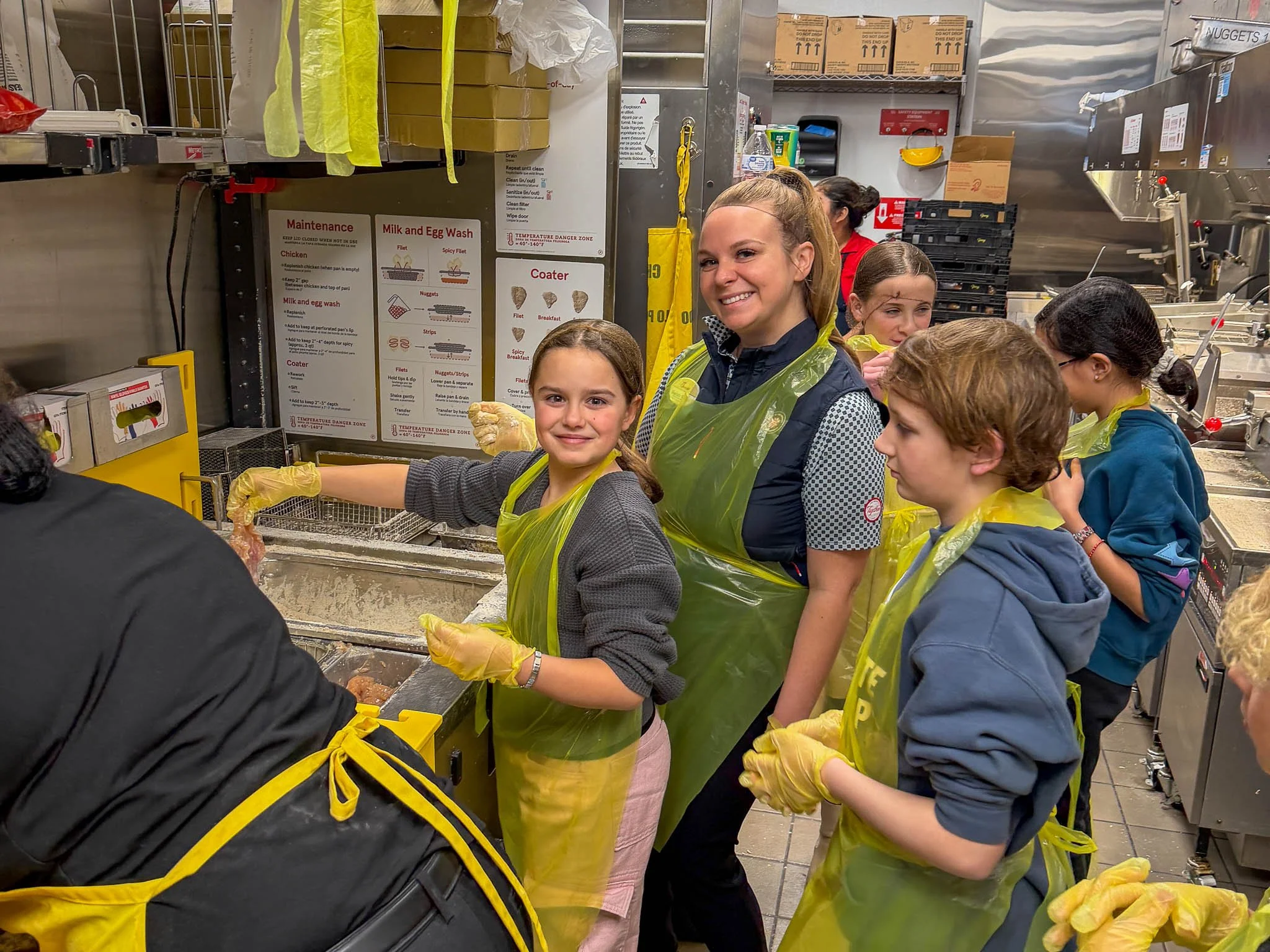 Once we got to the back, our guides showed us where each kind of food was made, and they showed us the freezer rooms, too! We learned some things, like how the workers have to wear yellow aprons when working with raw meat and white aprons when working with other foods. After they finished showing us around, they told us to wash our hands because they said we were going to make our own food. Now we were really getting excited!!! So, we put on the YELLOW aprons, and then they showed us how to “bread” the meat. It was really fun.
